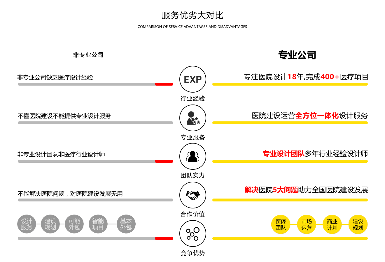業(yè)務(wù)體系——醫(yī)院建設(shè)服務(wù),醫(yī)匠只做醫(yī)療機(jī)構(gòu)建設(shè),經(jīng)過多年的業(yè)務(wù)經(jīng)驗(yàn),我們把醫(yī)院建設(shè)分為三大版塊,也就是醫(yī)院建設(shè)前期、中醫(yī)、后期的整個(gè)建設(shè)流程,形成了醫(yī)匠的專業(yè)服務(wù)體系,這是醫(yī)匠特有的業(yè)務(wù)體系,與服務(wù)理念相結(jié)合,形成了醫(yī)匠獨(dú)特的服務(wù),更好的服務(wù)于全醫(yī)及世界醫(yī)療機(jī)構(gòu),與其他建筑和裝飾公司相比,我們更懂醫(yī)療設(shè)計(jì)的特殊性。?