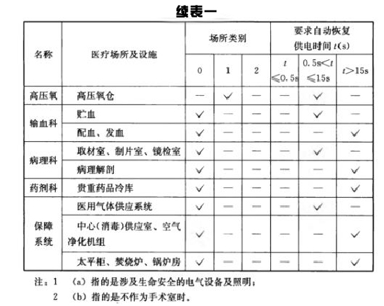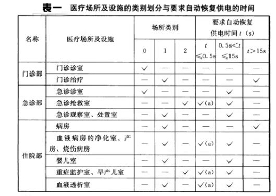 2、醫(yī)療場所分類及自動(dòng)恢復(fù)供電時(shí)間宜符合表一-規(guī)定。