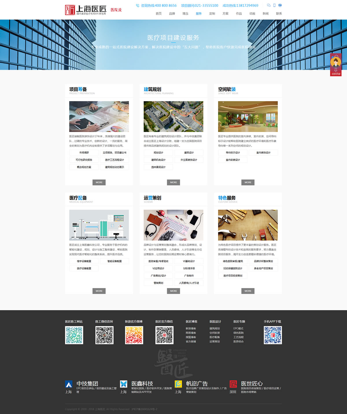 改版后的網(wǎng)站設(shè)置了企業(yè)信息、解決方案、服務(wù)體系、設(shè)計(jì)理念、設(shè)計(jì)作品、新聞中心、成功熱線(xiàn)、招聘信息等欄目。其中“解決方案”設(shè)置了綜合醫(yī)院、專(zhuān)科醫(yī)院、婦幼保健院、綠色醫(yī)院、醫(yī)療健康城、醫(yī)養(yǎng)結(jié)合等不同類(lèi)型的醫(yī)院項(xiàng)目以及解決方案,醫(yī)院投資管理者全方位多側(cè)面地了解醫(yī)匠的策劃及設(shè)計(jì)服務(wù)能力,給醫(yī)院投資者更多參考。此外,公司官方微博、微信也將陸續(xù)改版重現(xiàn),與客戶(hù)隨時(shí)進(jìn)行親密互動(dòng),展現(xiàn)醫(yī)匠人性化的服務(wù)理念。