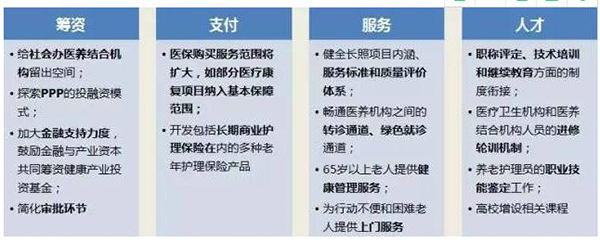 2015年11月,國務院辦公廳轉發(fā)國家衛(wèi)計委、民政部、發(fā)改委、財政部、人社部、住建部等九部委《關于推進醫(yī)療衛(wèi)生與養(yǎng)老服務相結合的指導意見》,明確了五大重點工作方向: