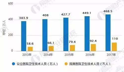2017年末中國(guó)醫(yī)院衛(wèi)生技術(shù)人員578.5萬(wàn)人,公立醫(yī)院衛(wèi)生技術(shù)人員468.5萬(wàn)人,比上年增加19.4萬(wàn)人,占比81.0%。民營(yíng)醫(yī)院衛(wèi)生技術(shù)人員110.0萬(wàn)人,比上年增加17.6萬(wàn)人,占19.0%。目前,公立醫(yī)院優(yōu)秀醫(yī)療人才依舊不愿到民營(yíng)醫(yī)院從業(yè),民營(yíng)醫(yī)院面臨人才短缺問(wèn)題。
