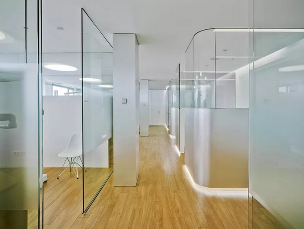 整個(gè)空間使用了通透的玻璃、中央的鋁制金屬盒以及溫馨而親切感的木質(zhì)地面三種材料創(chuàng)建了連續(xù)的、與職業(yè)相關(guān)的空間。