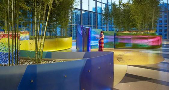 比如,芝加哥一兒童醫(yī)院空中花園就是自然化設(shè)計(jì)表達(dá)的典型案例?;▓@位于11層,由玻璃溫室覆蓋,患者可以感受室外季節(jié)與氣候的變化,從而感到輕松自然又愜意?;▓@依據(jù)患者行為路徑與心理活動(dòng),布置了竹子、天然石,水體等自然元素,為患者提供一個(gè)減壓與冥想的空間。彩色樹(shù)脂墻體上設(shè)置了LED板和運(yùn)動(dòng)感應(yīng)器,當(dāng)患者走過(guò)時(shí)會(huì)變幻動(dòng)態(tài)的色彩組合,仿佛墻面被賦予了生命,具有動(dòng)感和趣味。