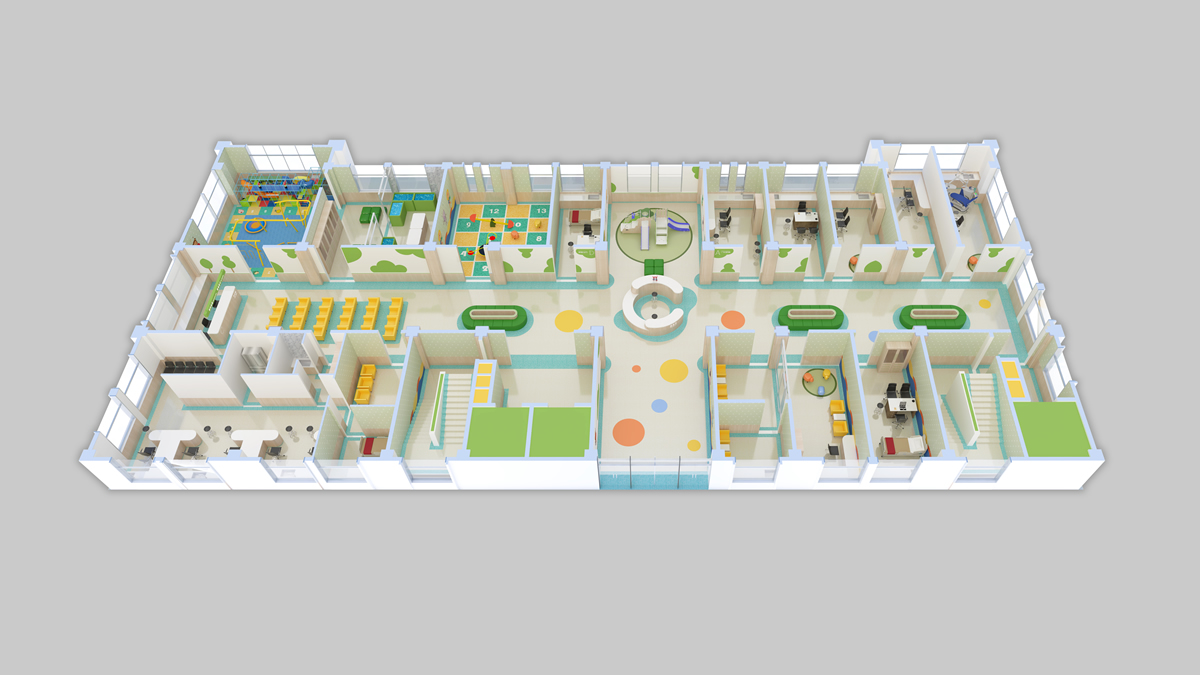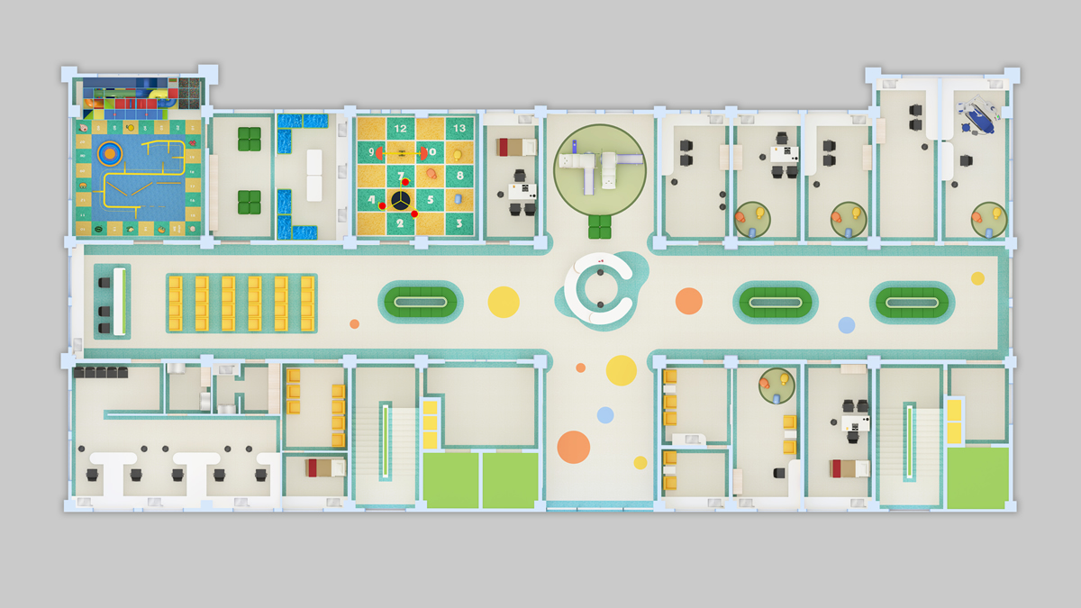 大廳是第一印象為主的空間,所以設(shè)計效果上更注重營造氛圍,重視光照和通風,體現(xiàn)兒童醫(yī)院的專業(yè)性、空間的舒適性,家具以木質(zhì)元素為主,并通過明亮的色彩,充滿童趣的空間以及兒童元素的提取,打造出親切活潑的氛圍,給患兒創(chuàng)造一個輕松、舒適、自然、便捷的診療空間。