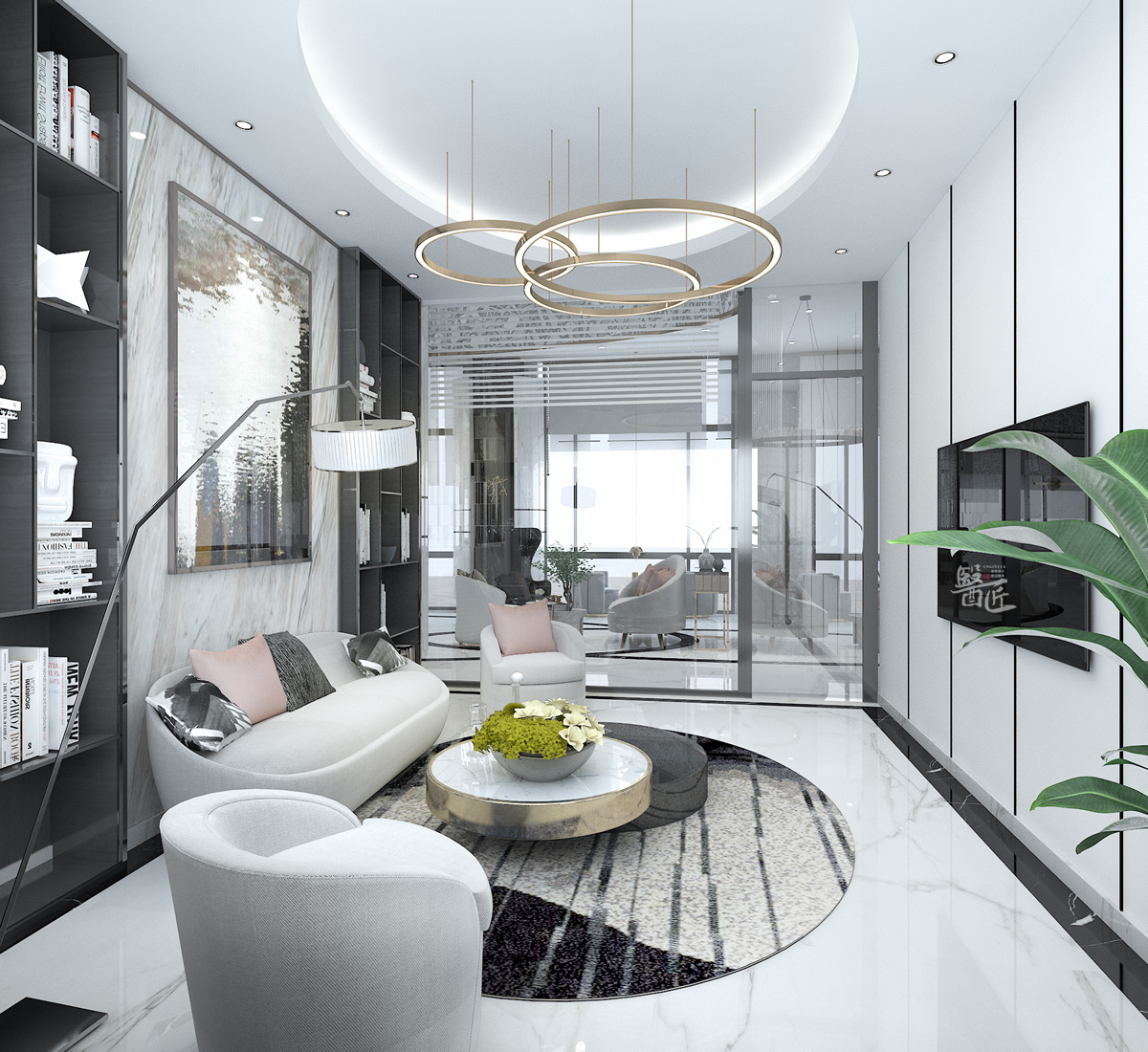 空間游離在黑白灰之間,并采用低飽和度的棕黃色及少許的橘粉色作為點綴,舒適的沙發(fā)、灰白色波紋地板、時尚的抱枕和富有設計感的幾何吊燈,營造出豐富多元的空間情感。色澤交替與造型轉換,都在不經意間彰顯個性與品位。